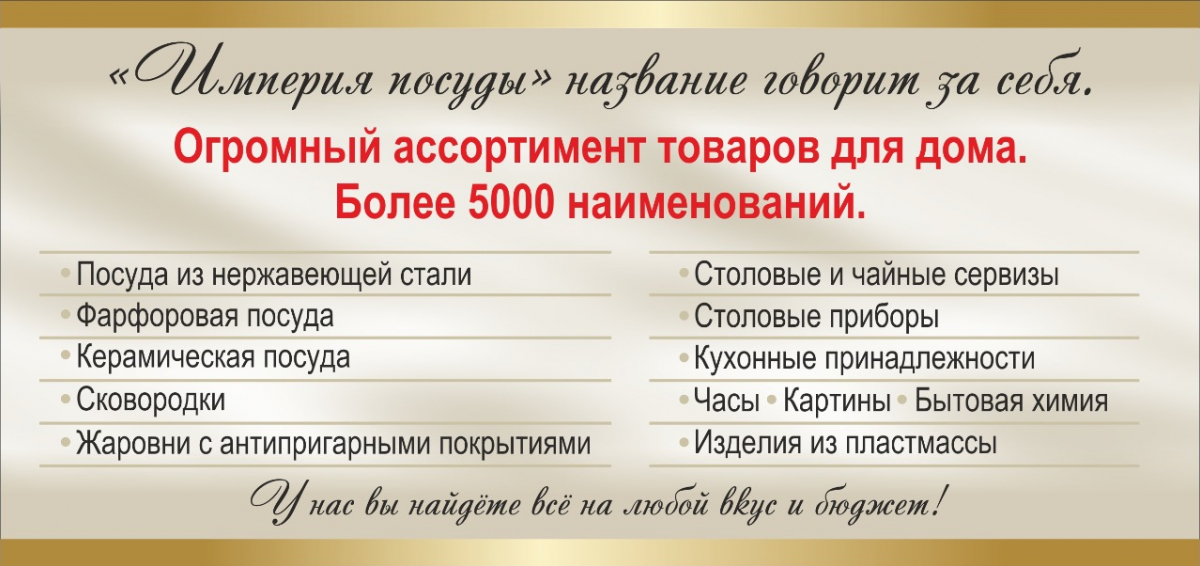 Столовые приборы, кастрюли, подносы, кухонная утварь - на этом не заканчивается широкий ассортимент магазина. В «Империи посуды» продаются красивые часы для декора, картины и многое другое, что точно не оставит вас равнодушными. И все это по скандально низким ценам и поставками напрямую от производителя. А значит, о качестве можно даже не переживать, ведь компания отбирает только самые надежные бренды перед тем, как выпускать товар в продажу.