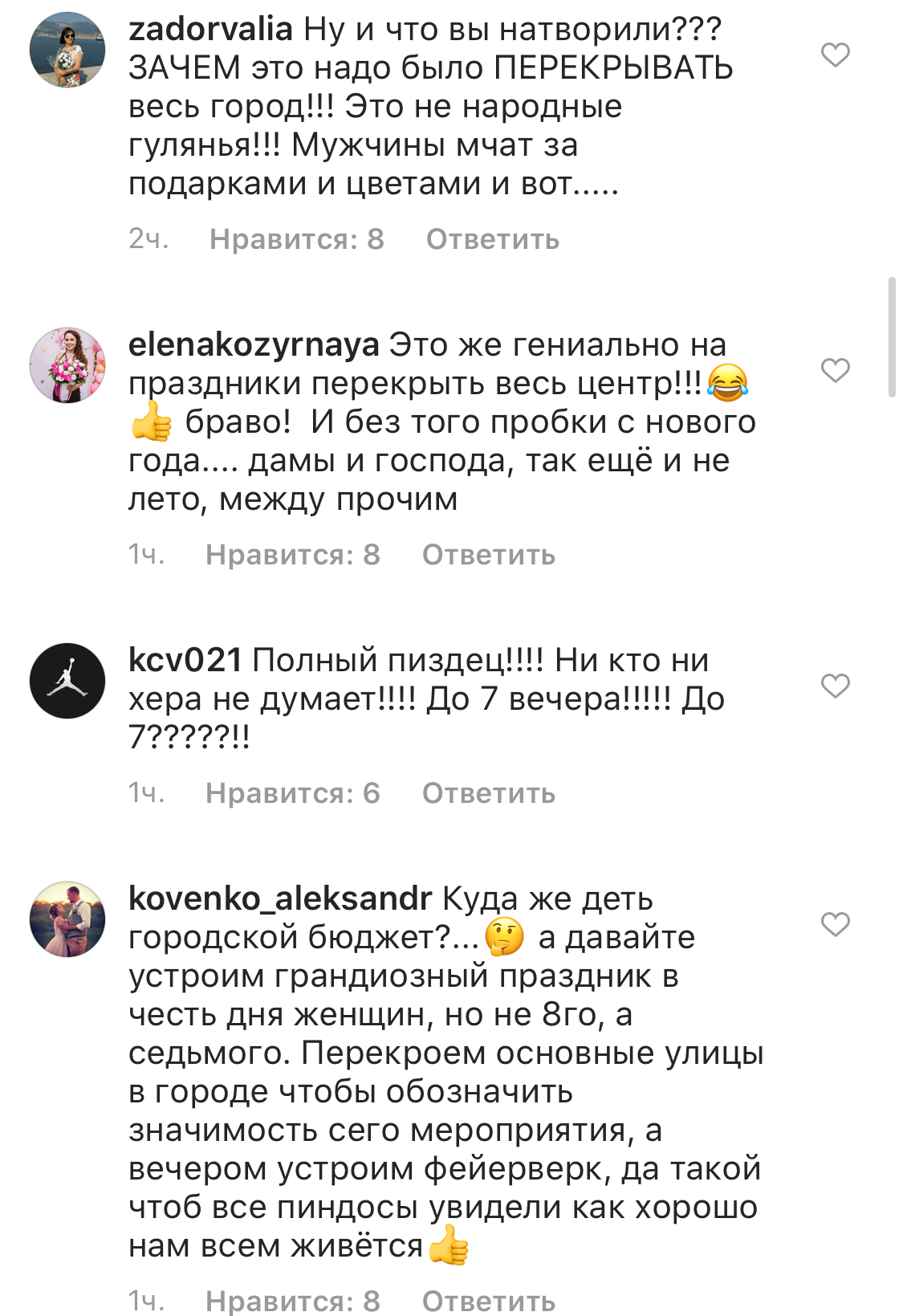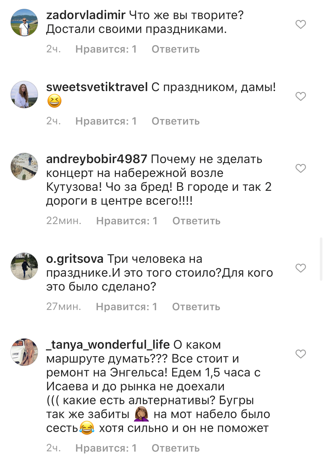 Жители выражают свое мнение в комментариях под публикациями в сети инстаграмм. Отношения горожан с властью складываются непросто - новороссийцы не стесняются в выражениях, когда речь касается явных просчетов и ошибок администрации и служб. Но недовольство перекрытием главной улицы в городе бьет все рекорды. Кто-то называет такое решение "местью народу" за многочисленные жалобы, кто-то не понимает, почему концерт нельзя провести в другом, более приспособленном для этого, месте. Тем более, что такое же мнение многие высказывали и после проведения на площади им.Ленина "Масленицы". "Блокнот" об этом писал. Удивляет жителей и решение устроить концерт не 8-го марта, а 7-го, накануне праздника, когда многие находятся в процессе подготовки, закупки подарков и продуктов. Появляются у горожан сомнения в необходимости массового действа в период нашествия коронавируса. Доходит до того, что некоторые начинают открыто сомневаться в способности главы города Игоря Дяченко выполнять функции градоначальника и сожалеют, что прямых выборов градоначальника больше нет.