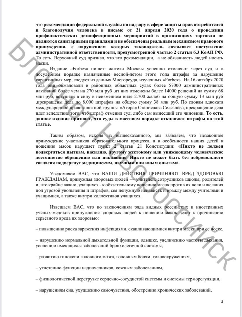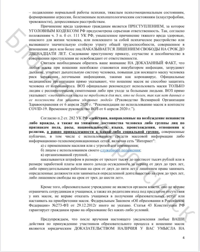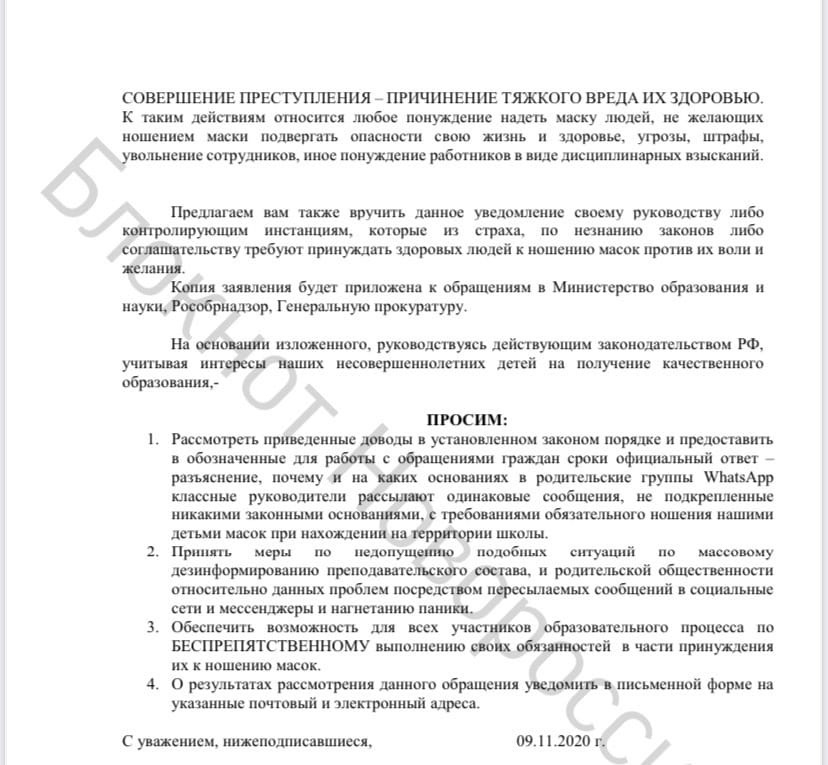 - Уведомляем ВАС, что ВАШИ ДЕЙСТВИЯ ПРИЧИНЯЮТ ВРЕД ЗДОРОВЬЮ ГРАЖДАНАМ, принуждая здоровых людей - учителей, сотрудников школы, родителей и, что крайне важно, учащихся - к обязательному ношению масок против их воли и желания под угрозой увольнения и штрафов, сея ненужную ненависть и вражду между учителями и учащимися, а также внутри коллективов учащихся, - обращаются недовольные родители и учителя к Управлению образования.
