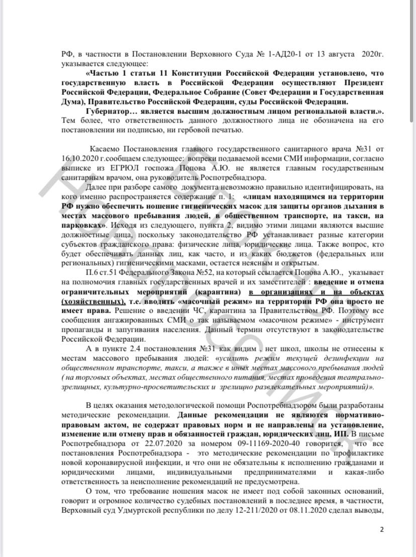 Управление образования мотивировало масочный режим в школах Постановлением Главного государственного санитарного врача Российской Федерации от 16.10.2020 № 31 "О дополнительных мерах по снижению рисков распространения СОVID-19 в период сезонного подъема заболеваемости острыми респираторными вирусными инфекциями и гриппом". Но на это у несогласных родителей и учителей тоже нашёлся ответ - в постановлении не указано, что школы являются местами массового скопления людей, а напротив: