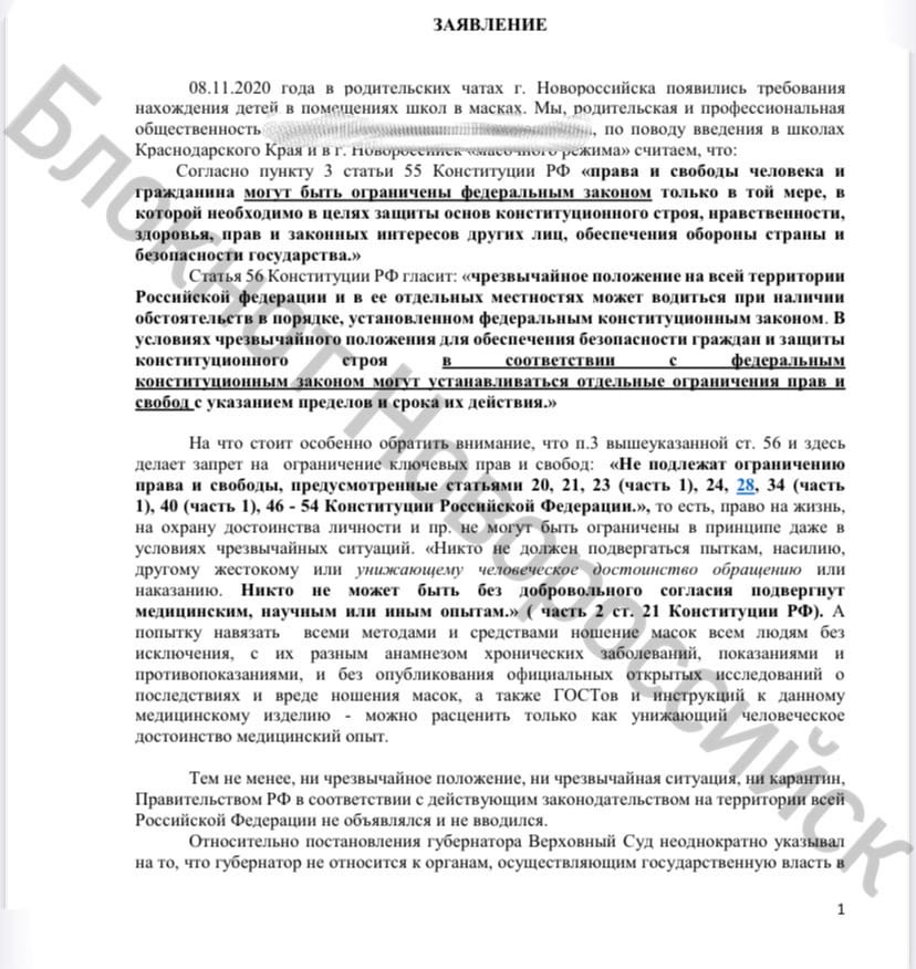 Родители учащихся одной из школ Новороссийска, а также педагоги, написали заявление в Генеральную прокуратуру Российской Федерации из-за введённого масочного режима в образовательных учреждениях. Они уверены, что Управление образования города-героя превысило свои полномочия и подвергает здоровье детей серьезной опасности. Полный текст документа имеется в распоряжении редакции.