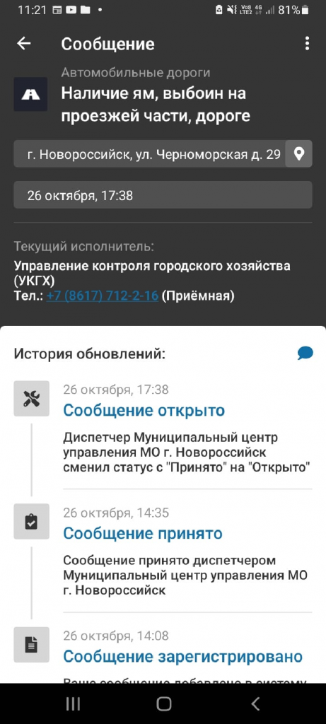 Напомним, что корреспондент «Блокнота» в начале этой истории обратился к Александру Яменскову – замглавы города, который курирует дорожное хозяйство. Александр Иванович рекомендовал обратиться жителям улицы Черноморская в «Безопасный город». Корреспондент сделал именно так. Позвонил по номеру горячей линии и оставил заявку в приложении «Мой Новороссийск». Её приняли ещё 26 октября: